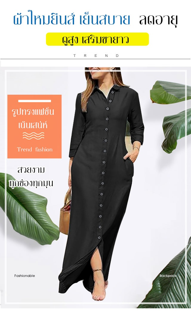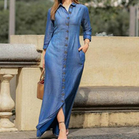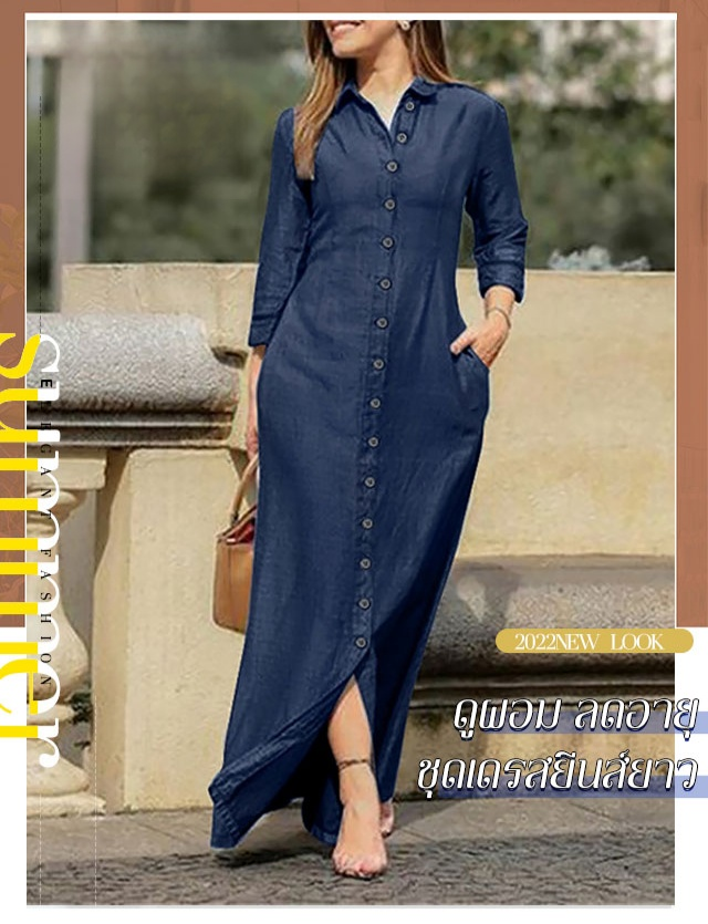 ชุดเดรสยีนส์ยาวปกคอเสื้อเชิ้ต ติดกระดุม